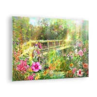 Obraz na skle - Most obklopený bujnou vegetáciou a farebnými kvetmi - 70x50cm - Mostík jarného vzdychania - Moderná nástenná dekorácia do obývacej izby a spálne ARTTOR