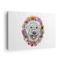Obraz na plátne - Pes obklopený farebnými kvetmi - 70x50cm - Šteňacia radosť - Moderná nástenná dekorácia do obývacej izby a spálne ARTTOR