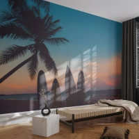 Fototapeta Standard Eco - Palma a surfové dosky na pozadí západu slnka - 100x70cm - Zajtra bude tiež zábava - Moderná nástenná dekorácia do obývacej izby a spálne ARTTOR