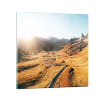 Nástenné hodiny - Kľukatá cesta v zlatom údolí osvetlenom zapadajúcim slnkom - 30x30cm - V zlatom údolí - Moderná nástenná dekorácia do obývacej izby, kuchyne a spálne ARTTOR