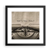 Nástenné hodiny - Detail písacieho stroja s nápisom Aký je tvoj príbeh? - 30x30cm - Povedz mi - Moderná nástenná dekorácia do obývacej izby, kuchyne a spálne ARTTOR