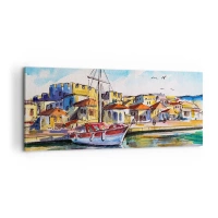 Obraz na skle - Farebný prístav s plachetnicou a stredomorskou architektúrou - 70x50cm - Dúhové popoludnie - Moderná nástenná dekorácia do obývacej izby a spálne ARTTOR