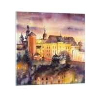 Nástenné hodiny - Hrad za súmraku v teplých akvarelových farbách - 30x30cm - Dejiny a rozprávka - Moderná nástenná dekorácia do obývacej izby, kuchyne a spálne ARTTOR