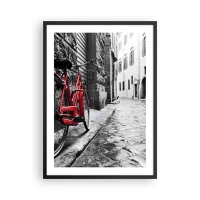 Plagát v čiernom ráme - Červený bicykel na čiernobielej dláždenej ulici - 50x70cm - Skutočná krása nestarne - Moderná nástenná dekorácia do obývacej izby a spálne ARTTOR