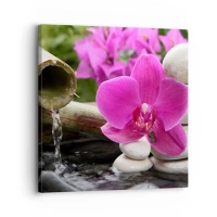 Nástenné hodiny - Fialové orchidey, bambus a kamene pri zdroji vody - 30x30cm - Už odpočívaš - Moderná nástenná dekorácia do obývacej izby, kuchyne a spálne ARTTOR