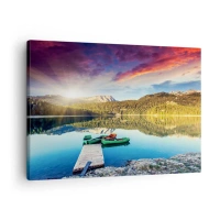 Obraz na plátne - Západ slnka nad jazerom s loďkami na móle - 70x50cm - Pri vode hladkej ako zrkadlo - Moderná nástenná dekorácia do obývacej izby a spálne ARTTOR