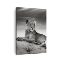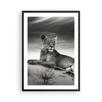 Plagát v čiernom ráme - Čiernobiely portrét leva odpočívajúceho v púšti - 50x70cm - Odpočinok kráľovnej púšte - Moderná nástenná dekorácia do obývacej izby a spálne ARTTOR