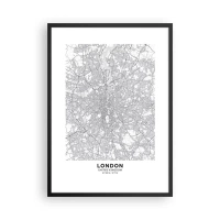 Plagát v čiernom ráme - Čiernobiela mapa Londýna s presnými detailmi ulíc - 50x70cm - Mapa londýnskeho labyrintu - Moderná nástenná dekorácia do obývacej izby a spálne ARTTOR