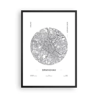 Plagát v čiernom ráme - Minimalistická čiernobiela mapa Birminghamu - 50x70cm - Anatómia Birminghamu - Moderná nástenná dekorácia do obývacej izby a spálne ARTTOR