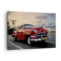 Obraz na skle - Červený klasický kabriolet na pozadí západu slnka - 70x50cm - Červená žiara trópov - Moderná nástenná dekorácia do obývacej izby a spálne ARTTOR