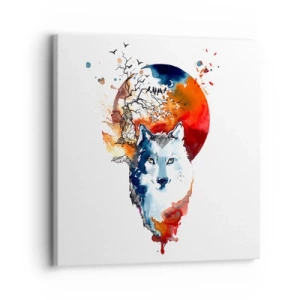 Obraz na plátne - Abstraktná akvarelová maľba vlka na pozadí červeného mesiaca - 70x50cm - Nosom na skle - Moderná nástenná dekorácia do obývacej izby a spálne ARTTOR