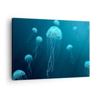 Obraz na plátne - Medúzy plávajúce v hlbinách oceánu v modrých tónoch - 70x50cm - Oceánsky tanec - Moderná nástenná dekorácia do obývacej izby a spálne ARTTOR